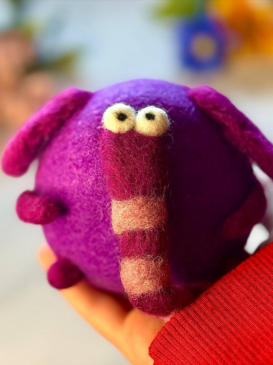 Handcrafted from vibrant wool in deep purples and soft pinks, this needle felted marvel isn’t just adorable — he’s mysteriously magical. Is he a wizard? A circus illusionist? No one knows for sure. But one thing’s certain: he’s the star of the show.